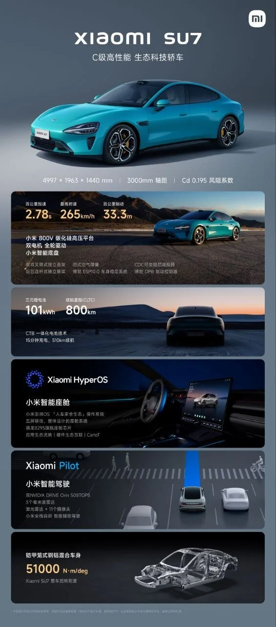 Революционный седан C-класса Xiaomi SU7: с 0 до 100 за 2,78 секунды, 800 км хода и умное шасси