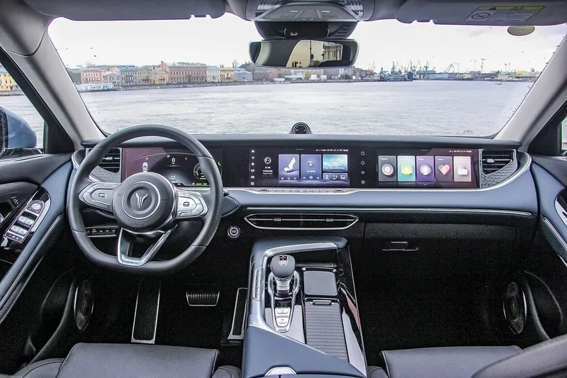 Интерьер Voyah Free EVR не менее впечатляющий. Салон оснащен подвижной панелью с тремя экранами, что добавляет футуристичности и технологичности. Этот элемент дизайна не только красив, но и подчеркивает инновационный подход компании. При этом подвижная панель является демонстрацией новейших технологий, хотя и может вызвать вопросы о долговечности такого механизма.